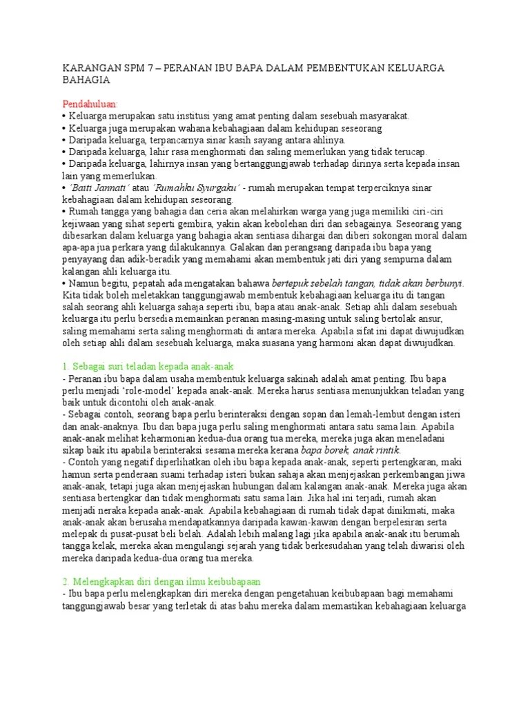 Contoh Karangan Bahasa Melayu BM Kertas 1 SPM Keluarga Bahagia Masyarakat SejahteraSijil Pelajaran Malaysia. Hal tersebut akan membuatkan kehidupan menjadi lebih damai dan juga tenteram. KARANGAN SPM 7 PERANAN IBU BAPA DALAM PEMBENTUKAN KELUARGA BAHAGIA.